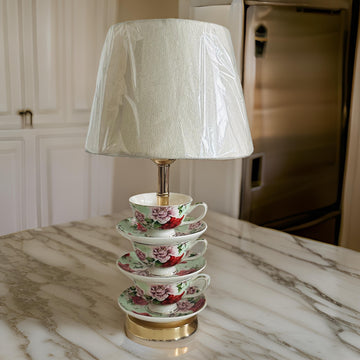The “Green Bridgeton Teacup Lamp” is a unique and artistic lighting piece crafted from an elegant stack of vintage-inspired teacups and saucers. Each teacup features a vibrant floral design with lush pink and red roses against a soothing green background. The stack is securely mounted on a polished gold-toned base, giving it a touch of sophistication. The lamp is crowned with a classic cream-colored shade that complements the delicate charm of the teacups, casting a soft, warm glow. This lamp blends timeless elegance with whimsical charm, making it a perfect statement piece for any kitchen, dining area, or cozy corner.