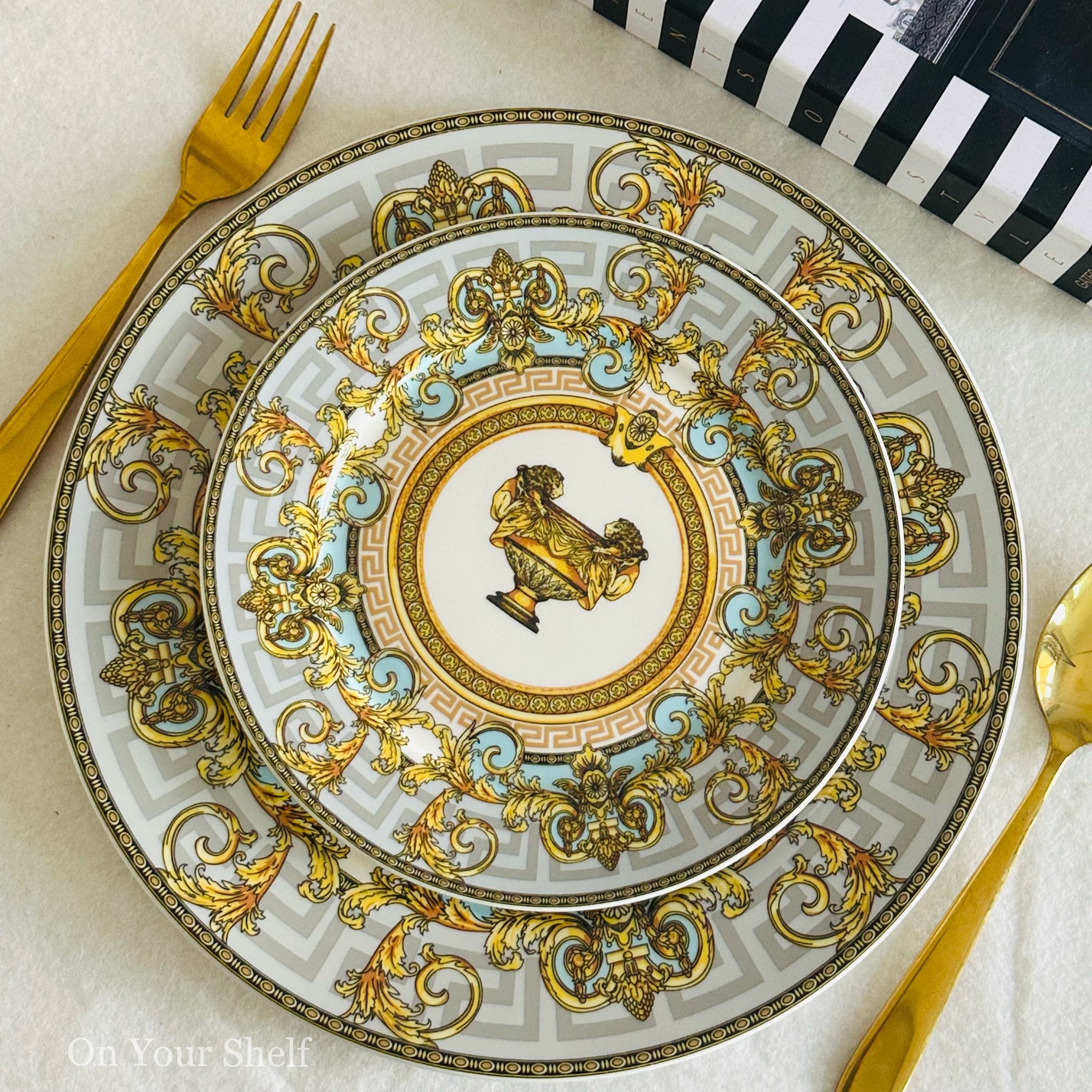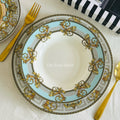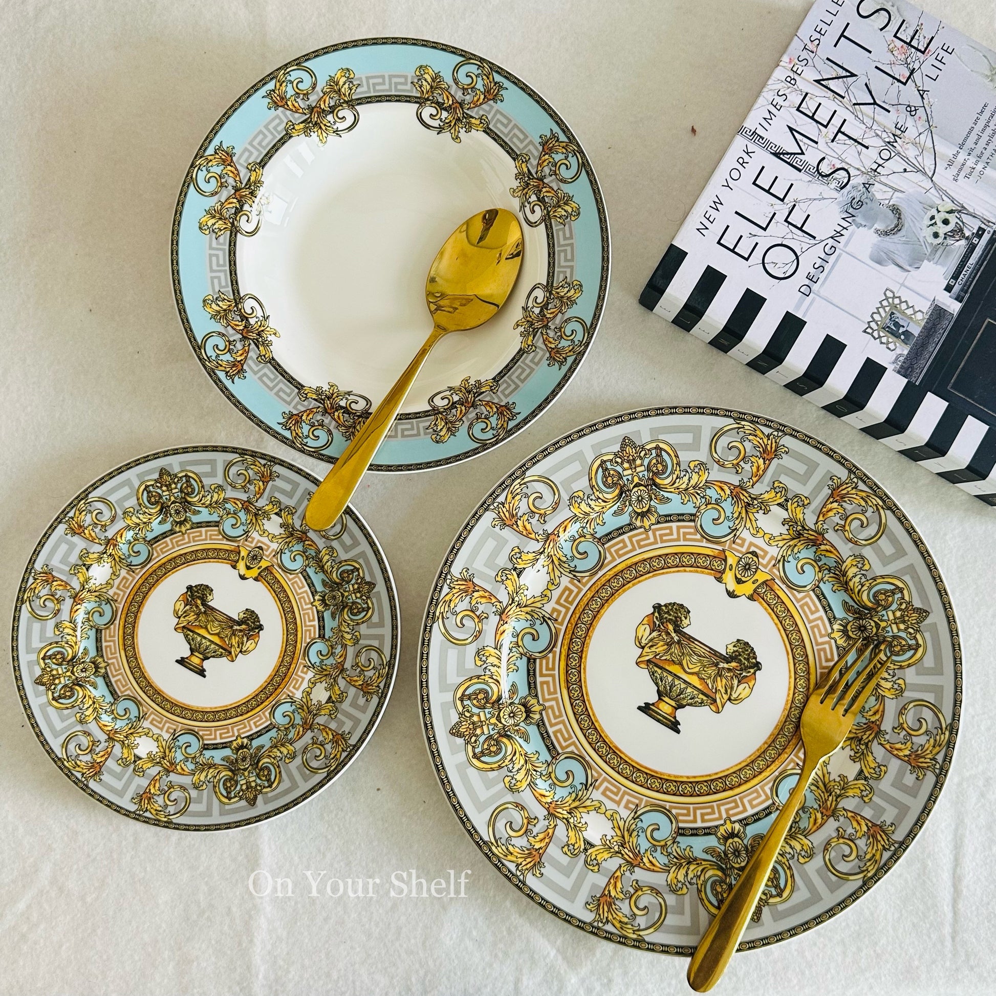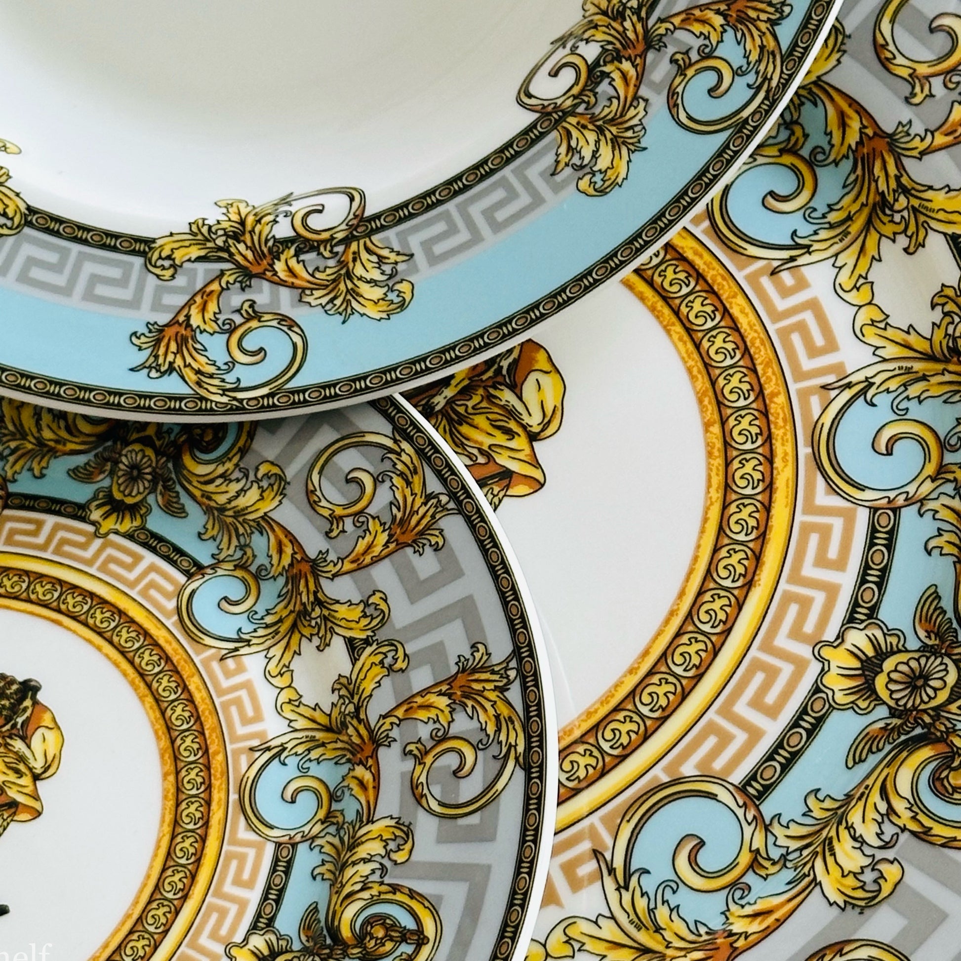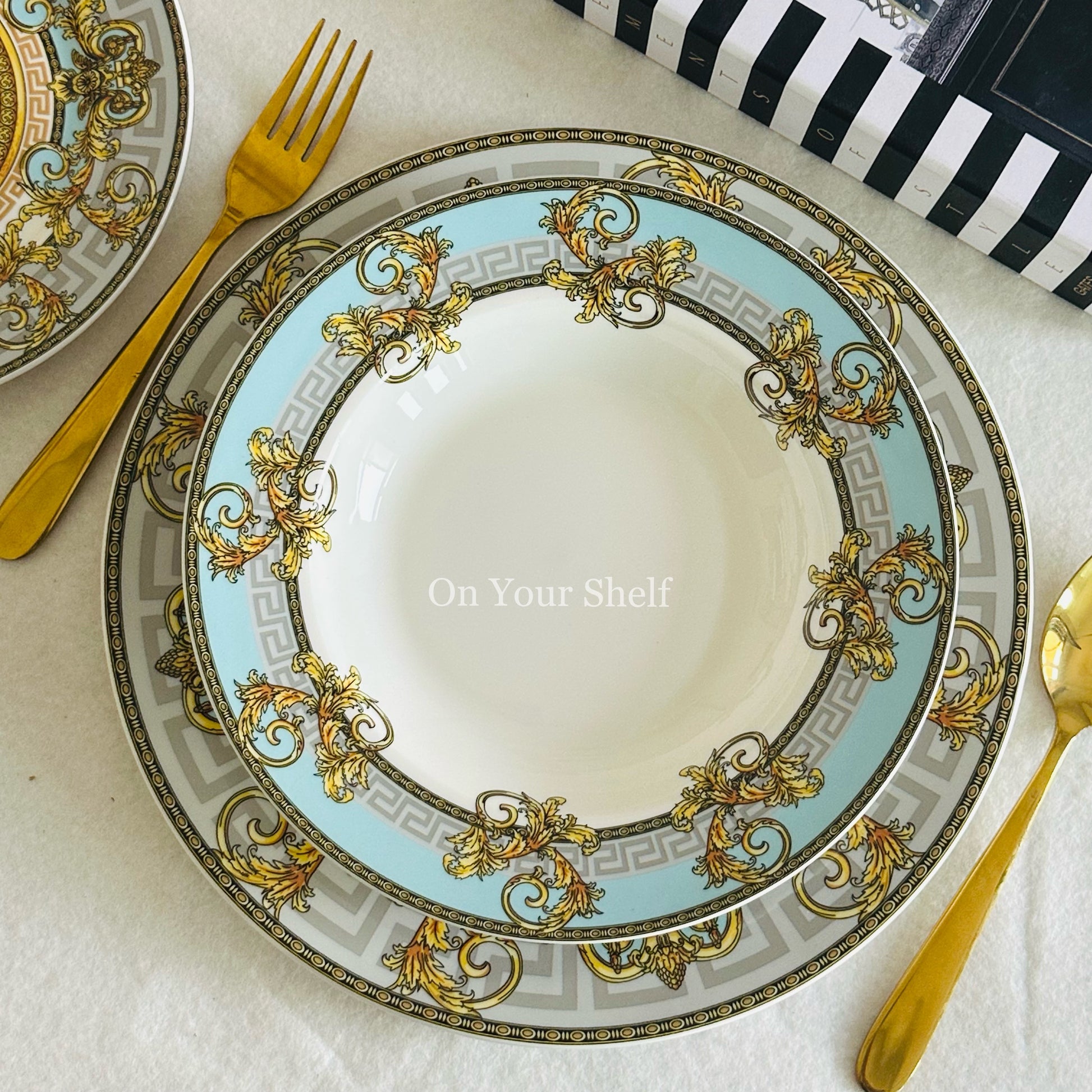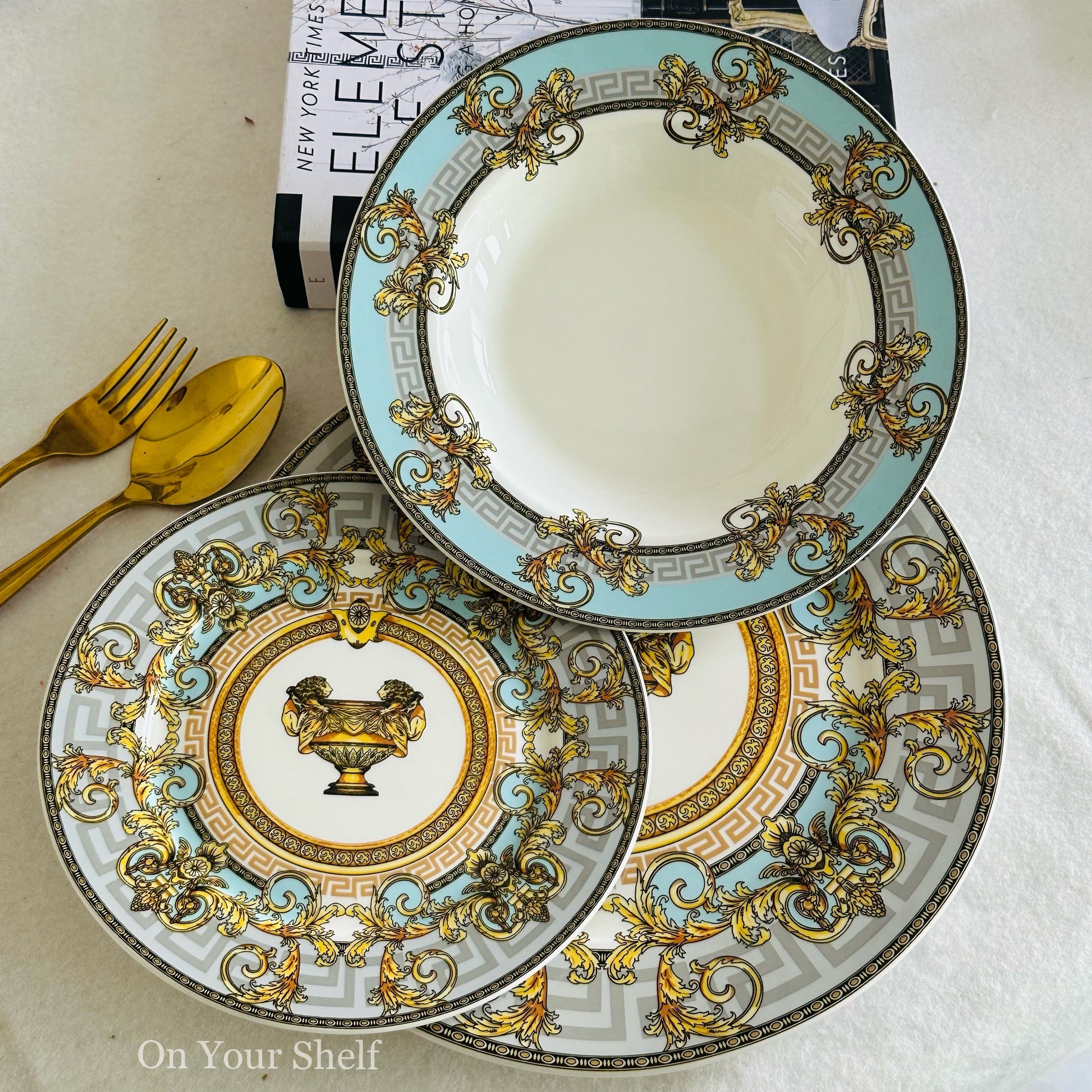Lusso Italia is a testament to refined European craftsmanship, inspired by the opulent grandeur of classical Italian design. This 18-piece bone china plate set exudes sophistication with its intricate gold detailing, baroque flourishes, and Greco-Roman motifs. The elegant contrast of soft blue and regal gray, paired with gilded accents, evokes the timeless beauty of Italian aristocracy, making each dining experience feel like a grand affair.