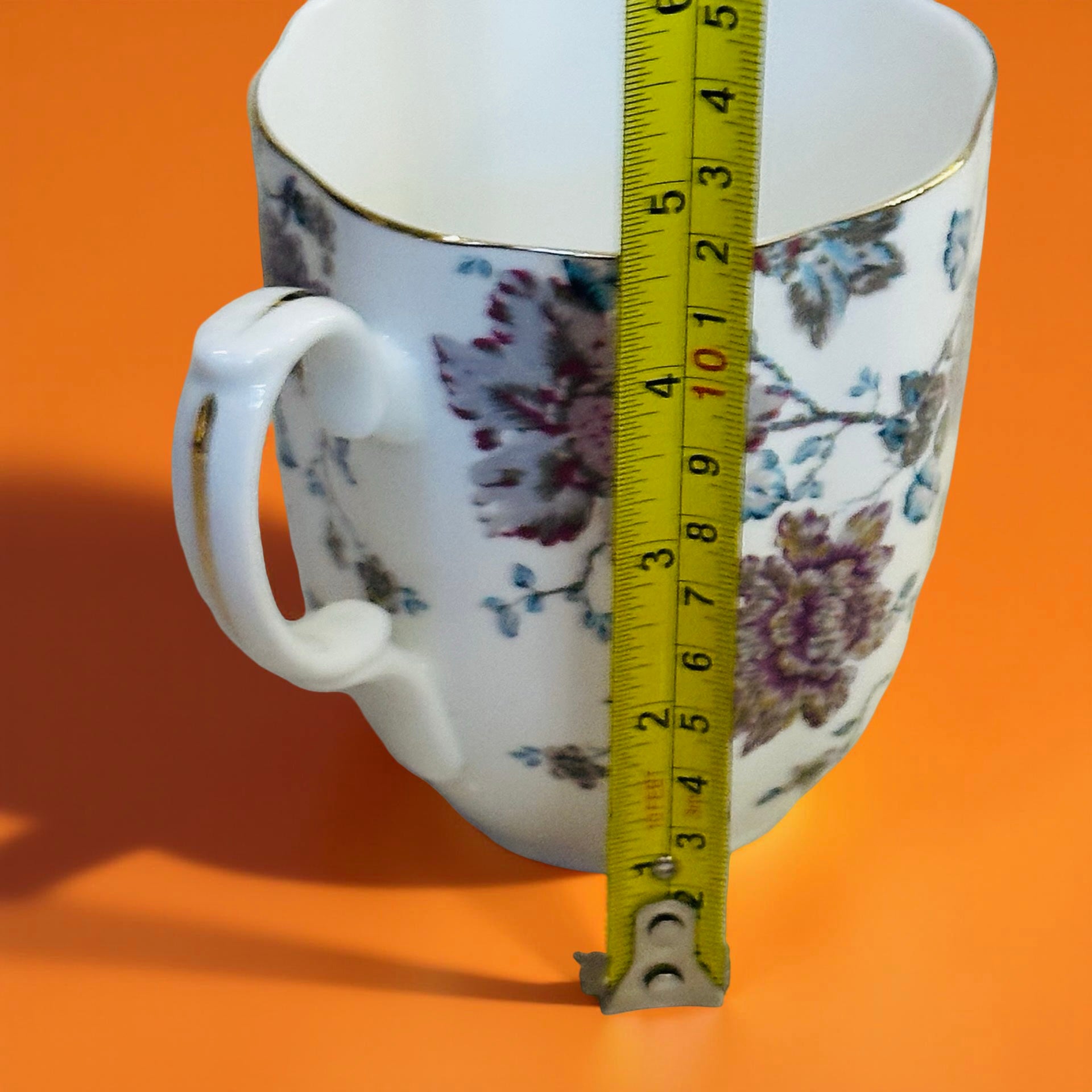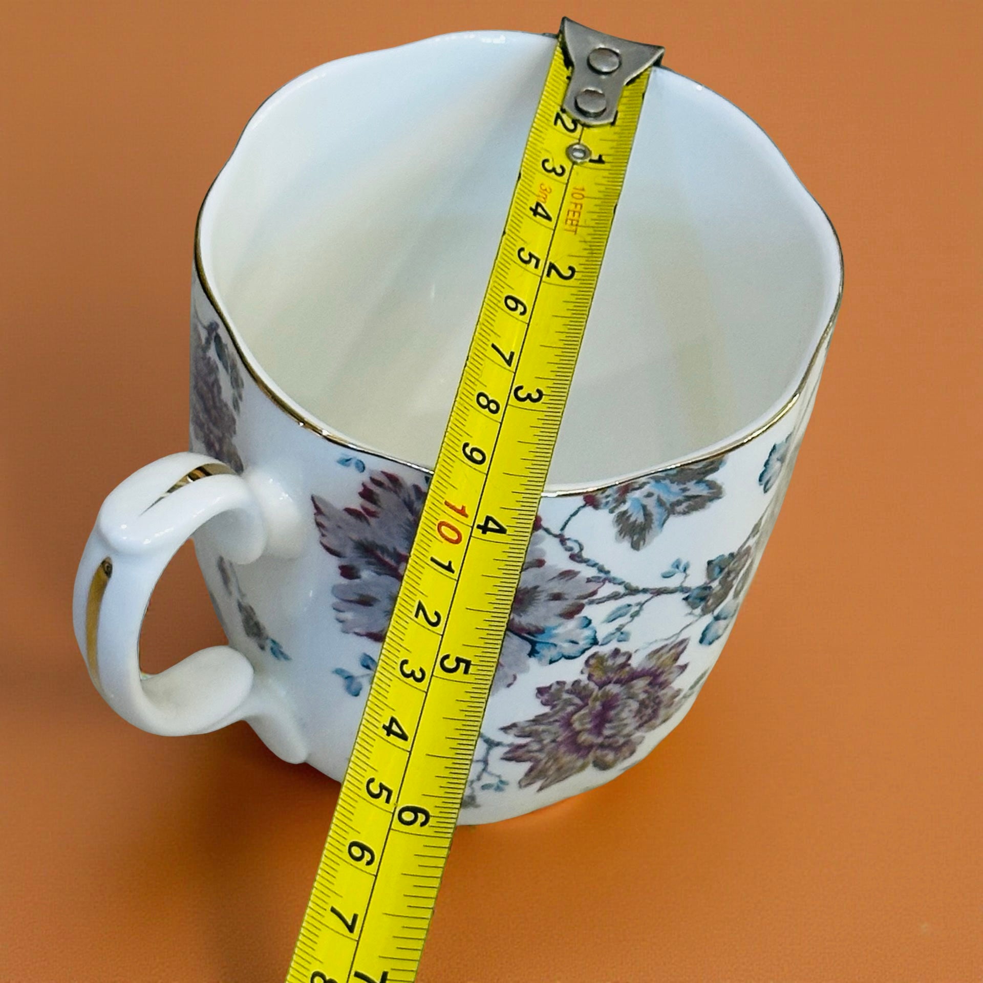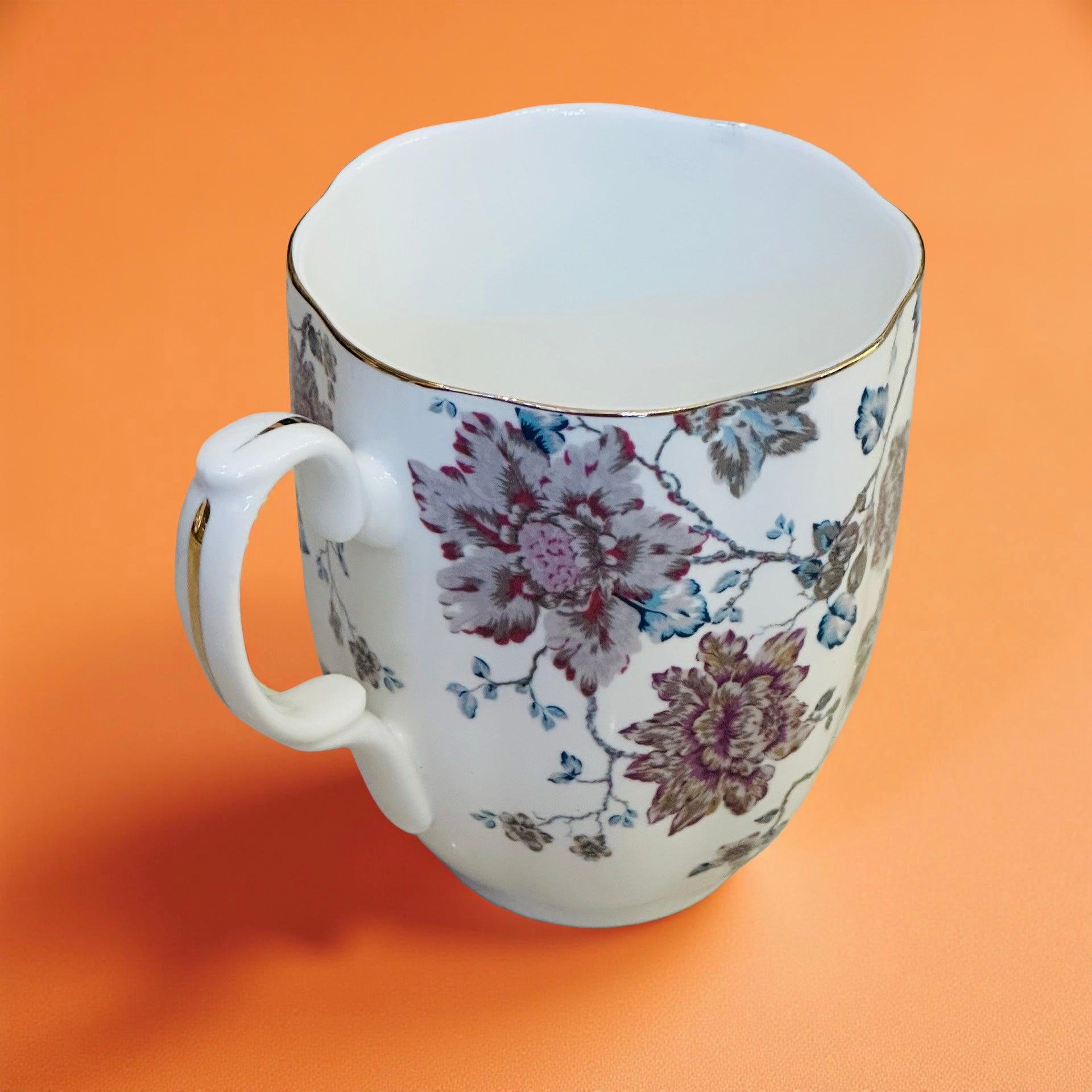 The mug’s silhouette is gently scalloped, finished with a fine gold rim that adds understated luxury without overpowering the design. The handle, adorned with a delicate gold accent, offers a comfortable grip, making it as practical as it is beautiful.