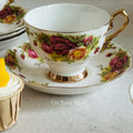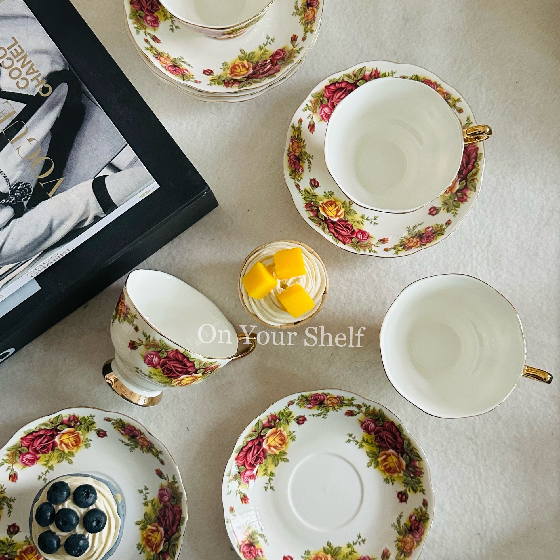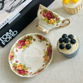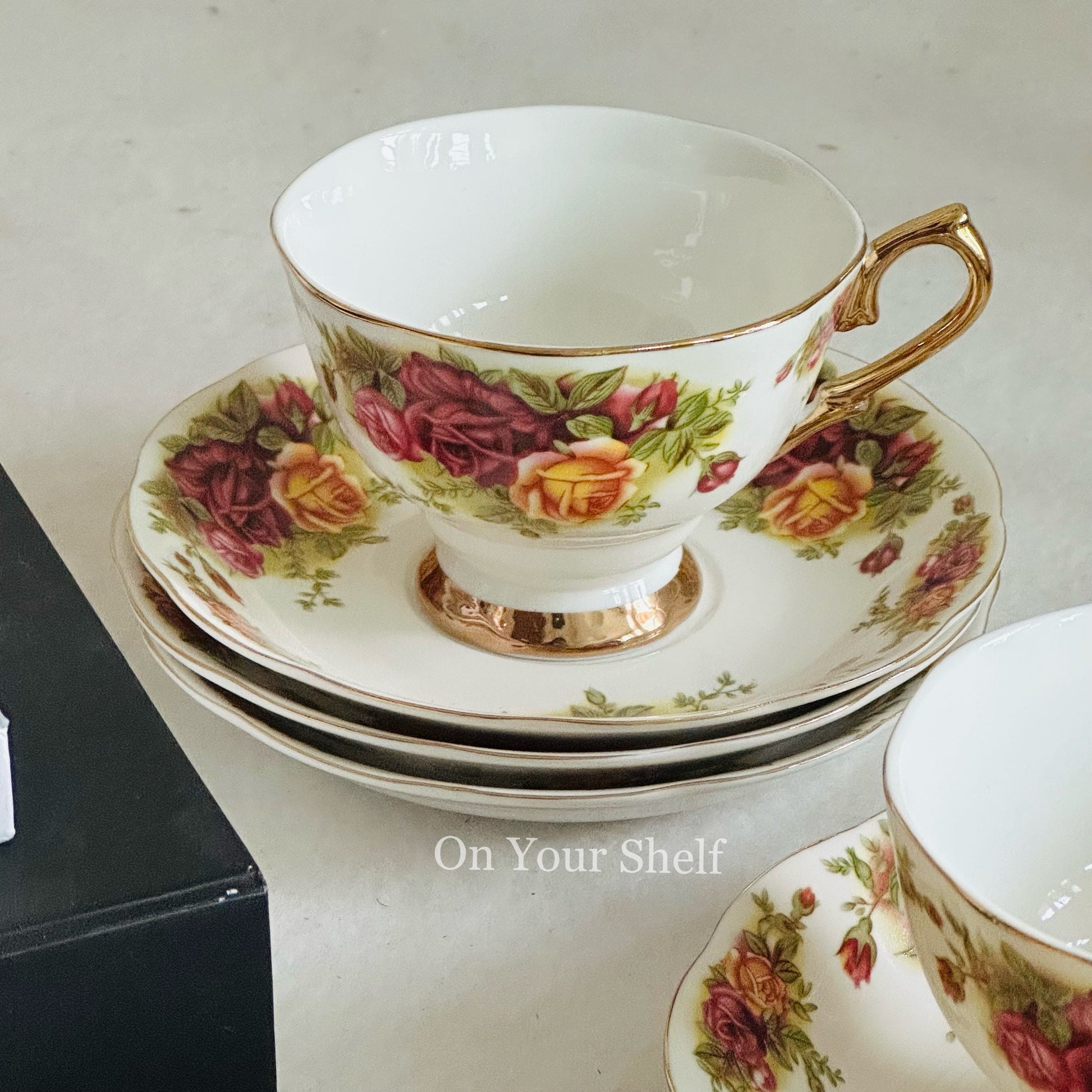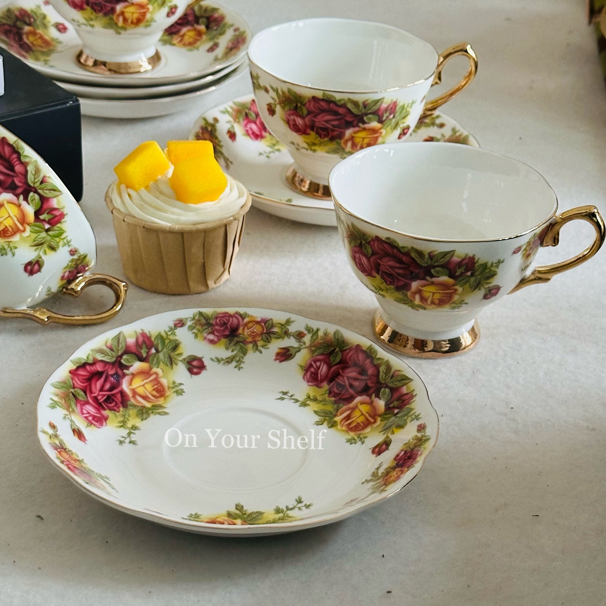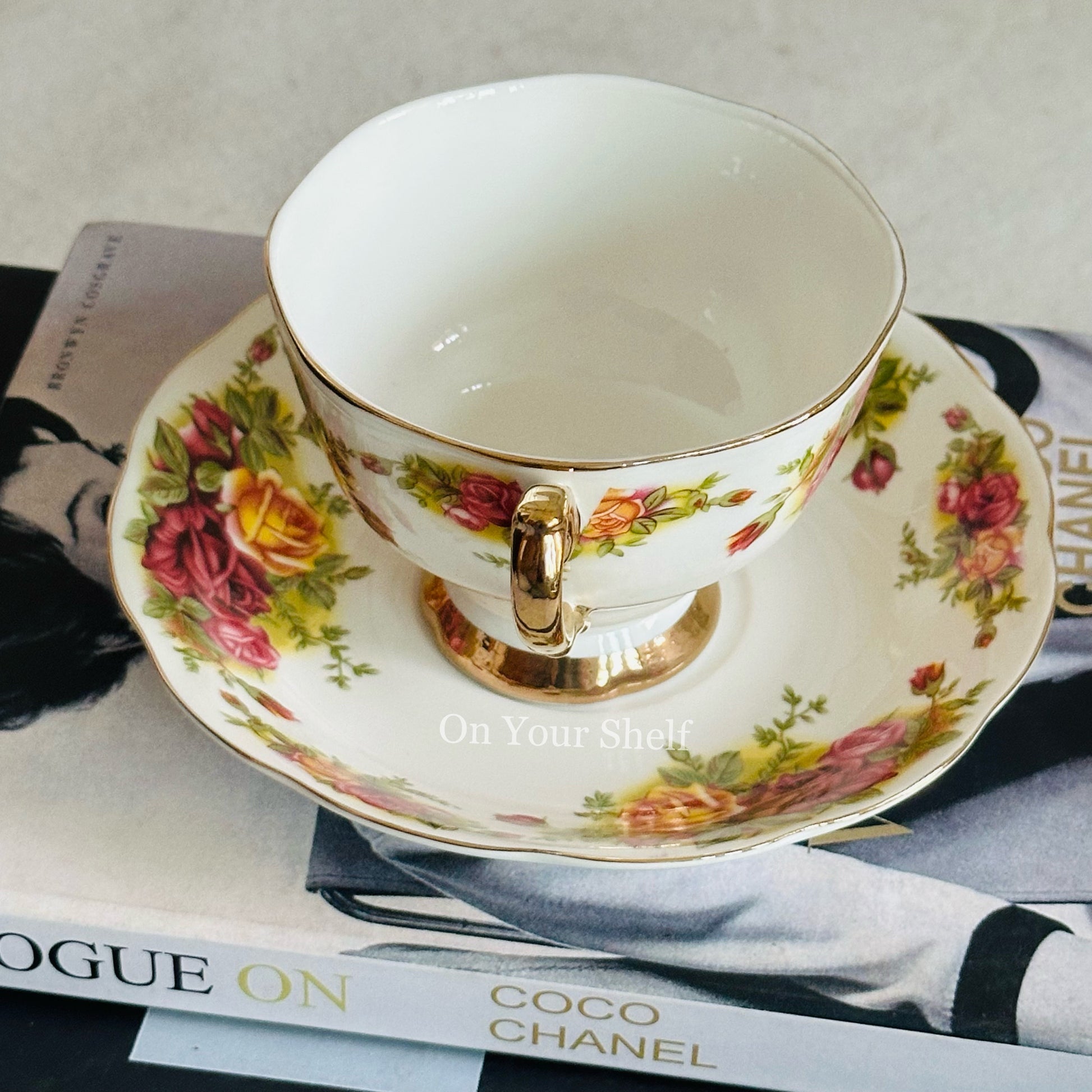 The ‘Secret Garden Old Country Rose’ teacup and saucer exudes timeless elegance and vintage charm. This exquisite design features a classic English floral pattern with rich red, vibrant yellow, and soft pink roses blooming amidst lush green leaves. The flowers delicately adorn both the cup and the saucer, creating a harmonious, nostalgic aesthetic.