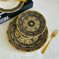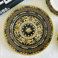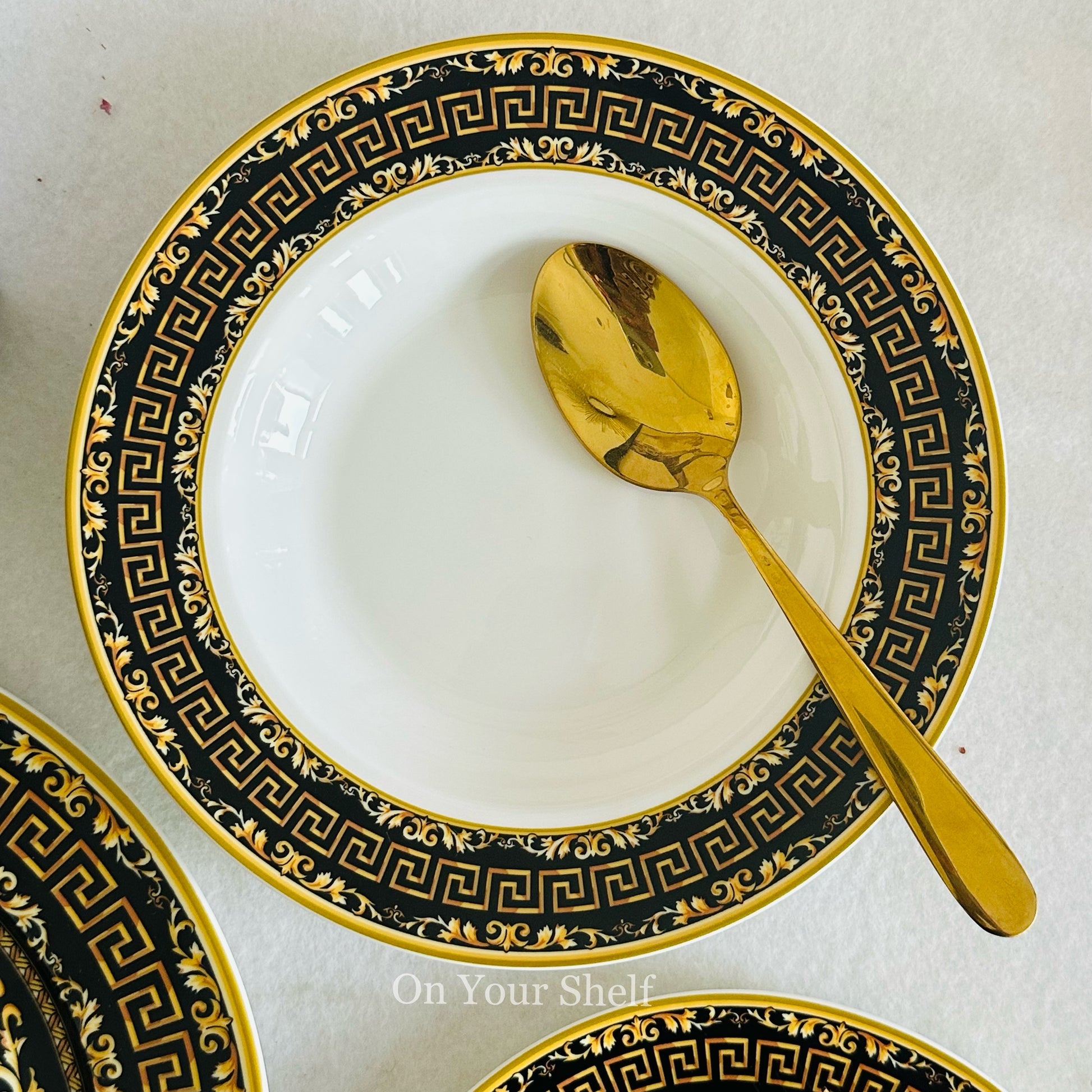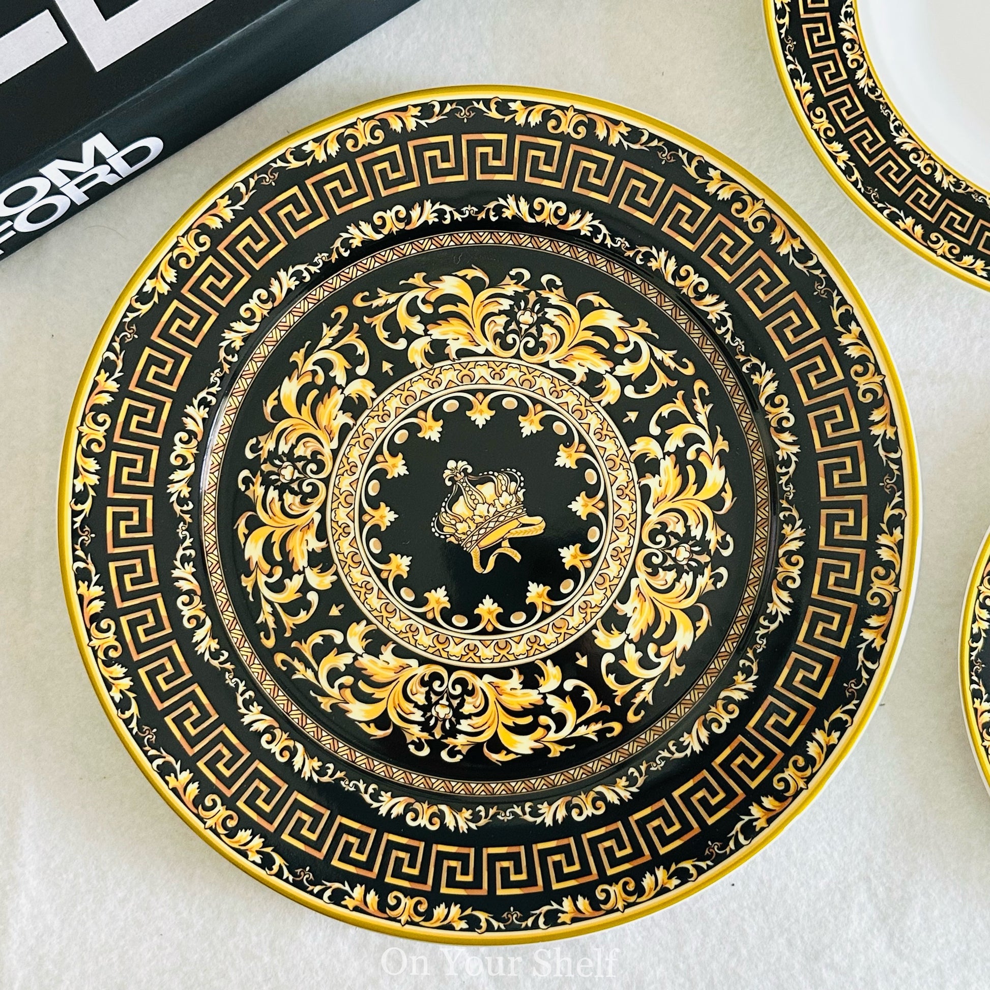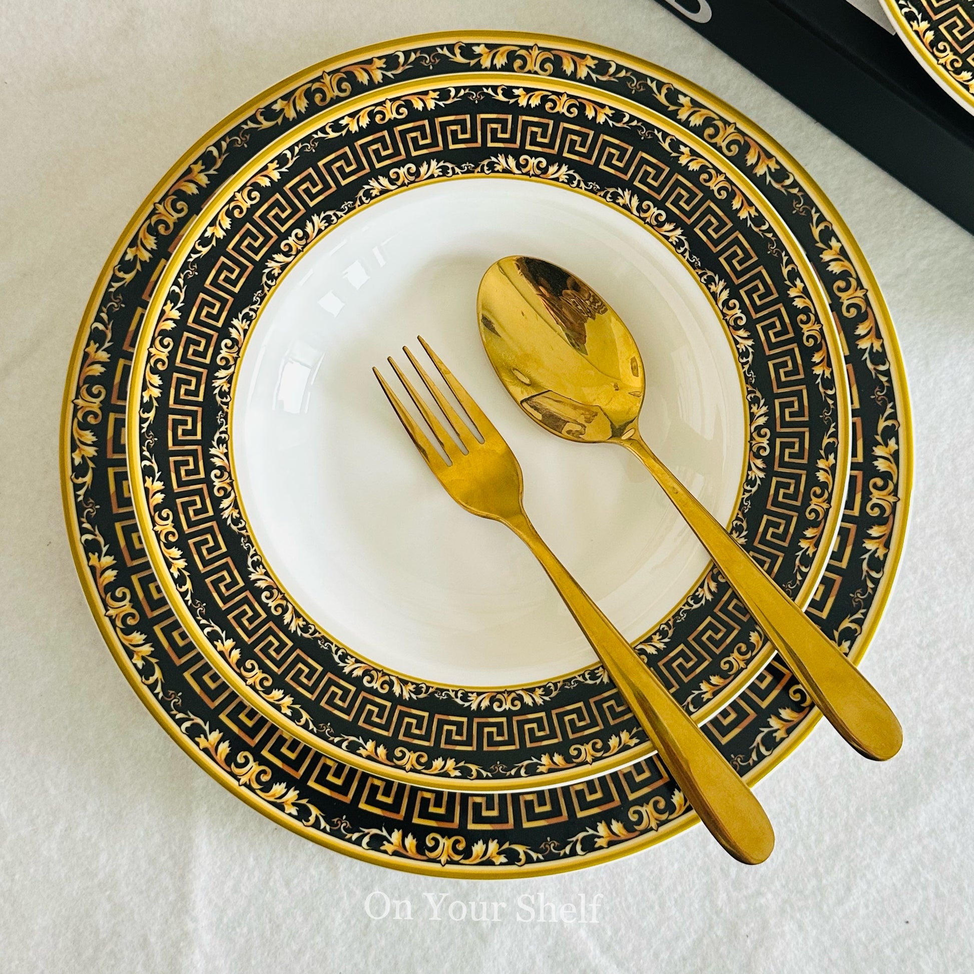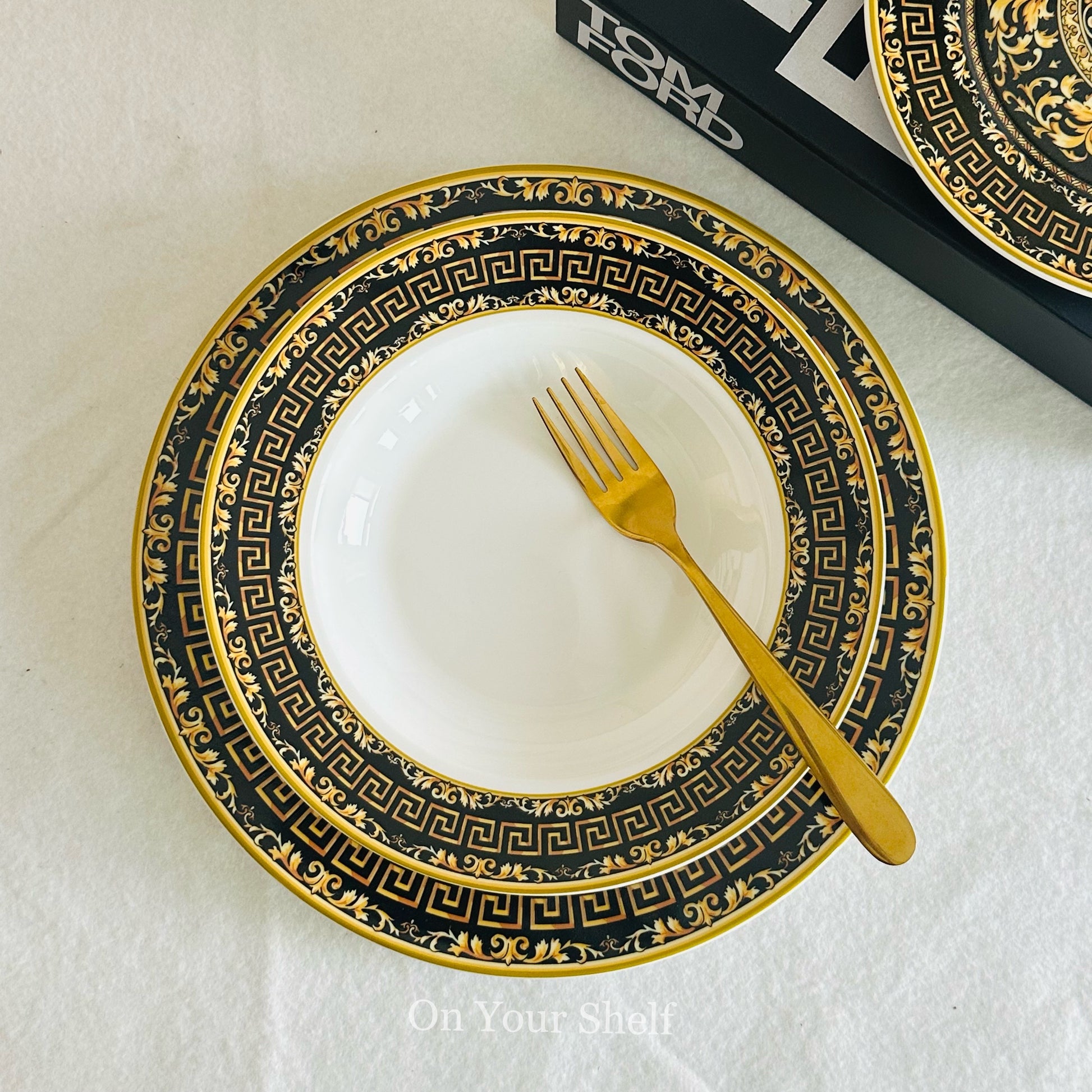 A masterpiece of luxury and refinement, this 18-piece bone china plate set embodies the essence of grandeur. The striking black base serves as a bold canvas for intricate gold embellishments, featuring ornate baroque scrollwork and Greco-Roman-inspired motifs. The delicate balance between rich gold detailing and deep noir hues creates an air of regal sophistication, making this collection a true statement of timeless elegance. The Greek key border reinforces the classical aesthetic, reminiscent of palatial interiors and aristocratic feasts.