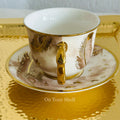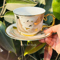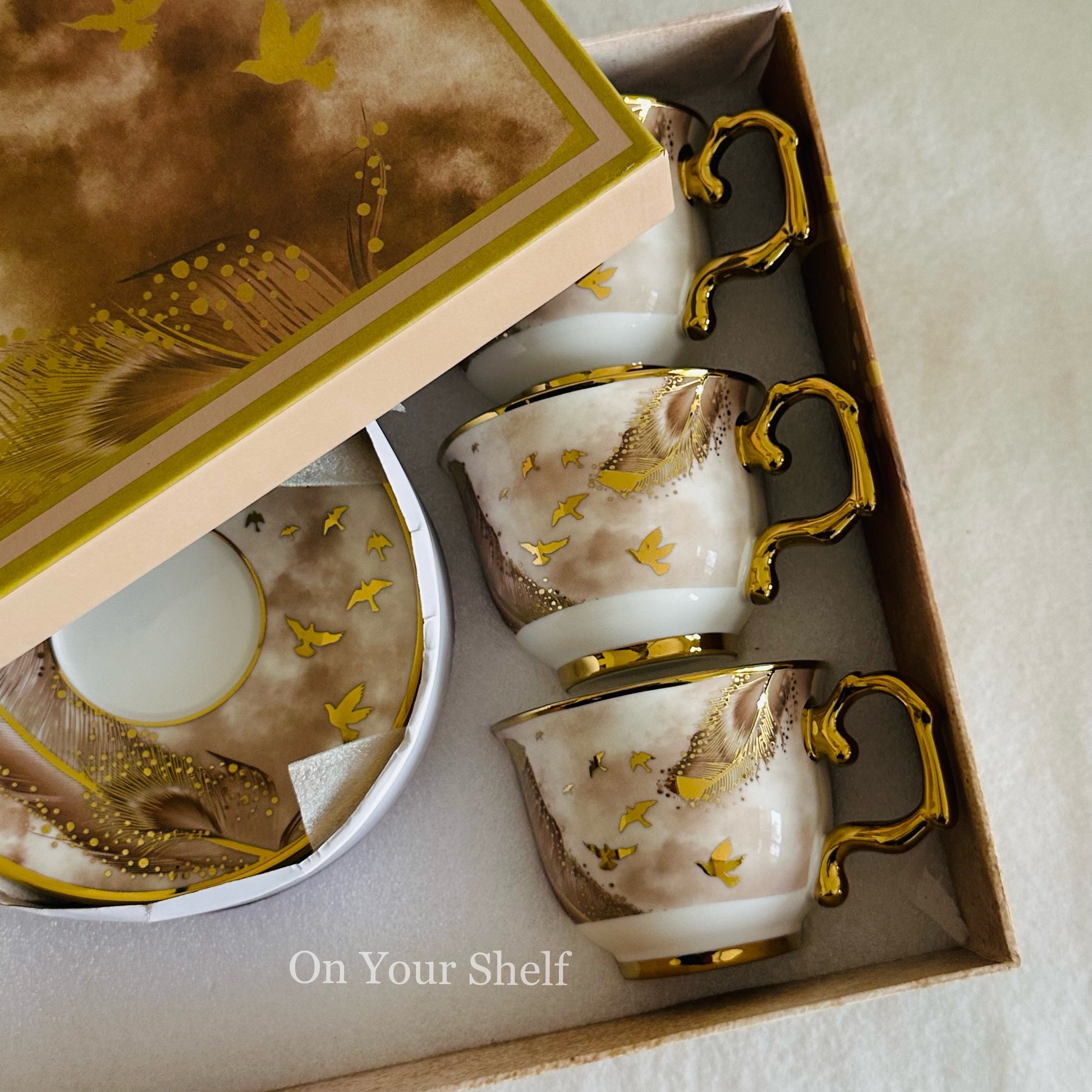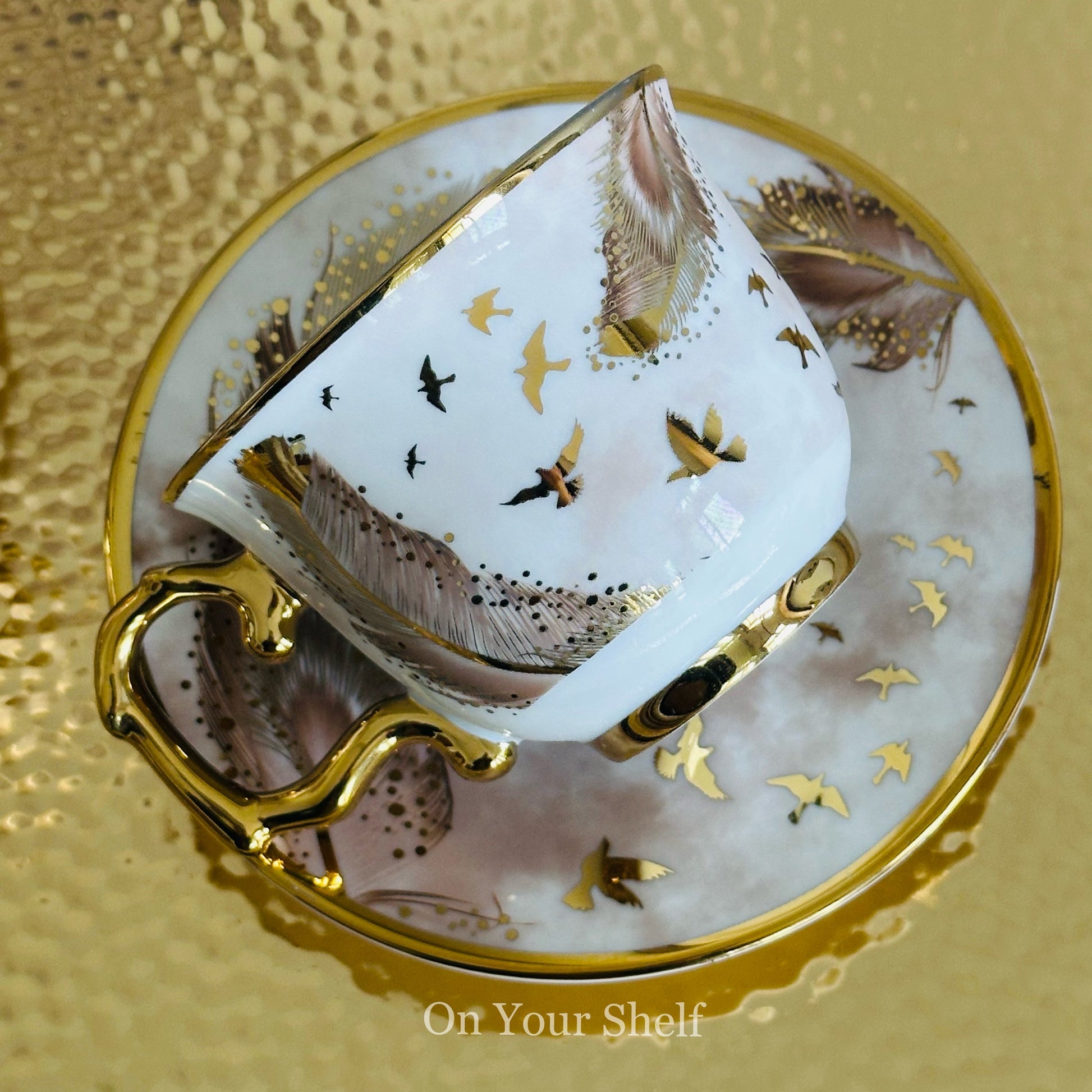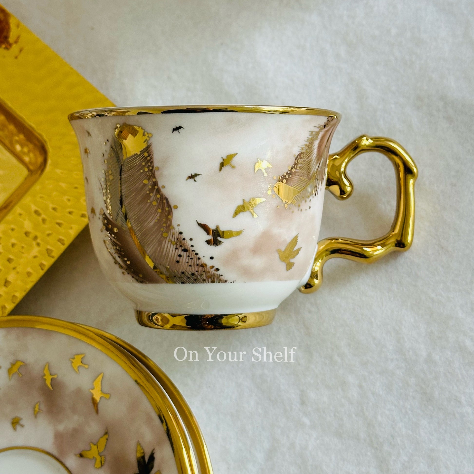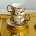 Made with high-quality porcelain, each cup features a stunning gold and white design of a soaring bird.