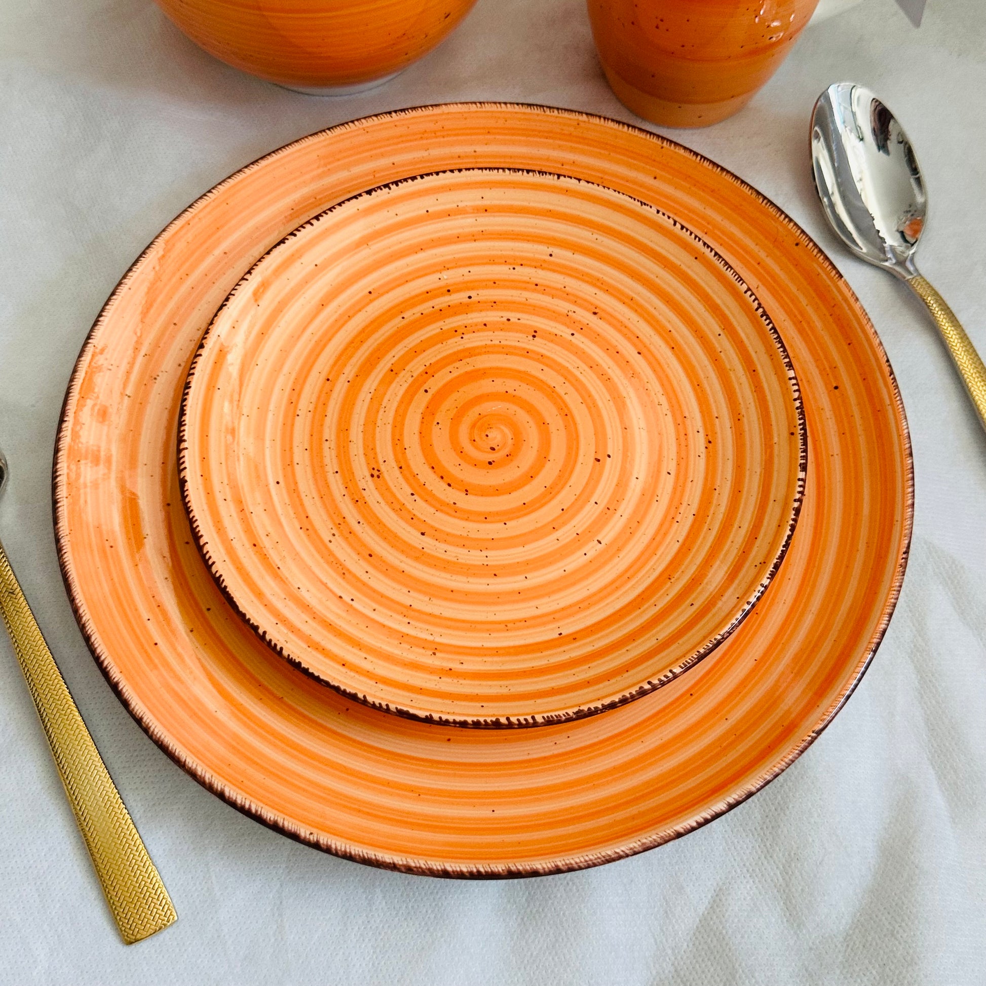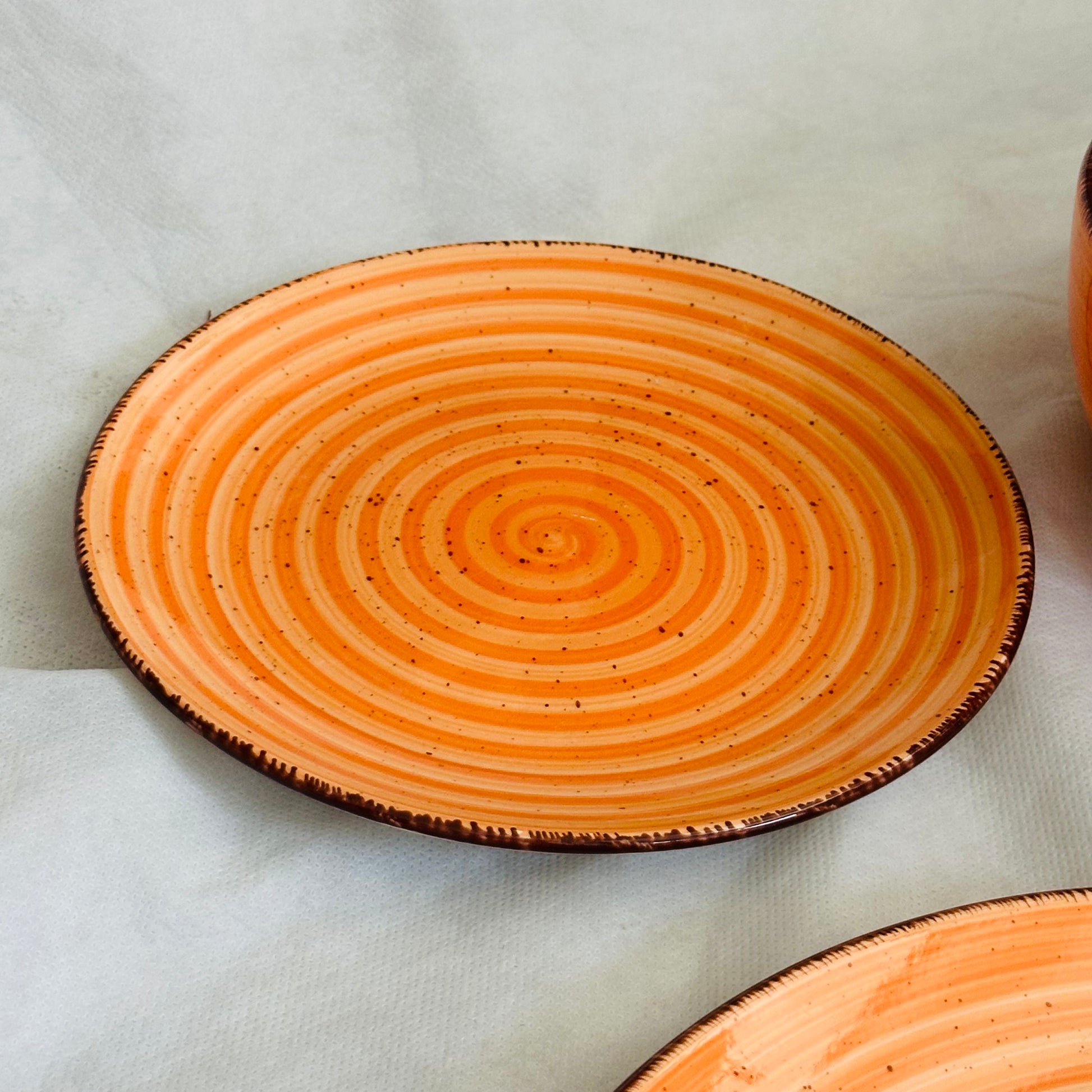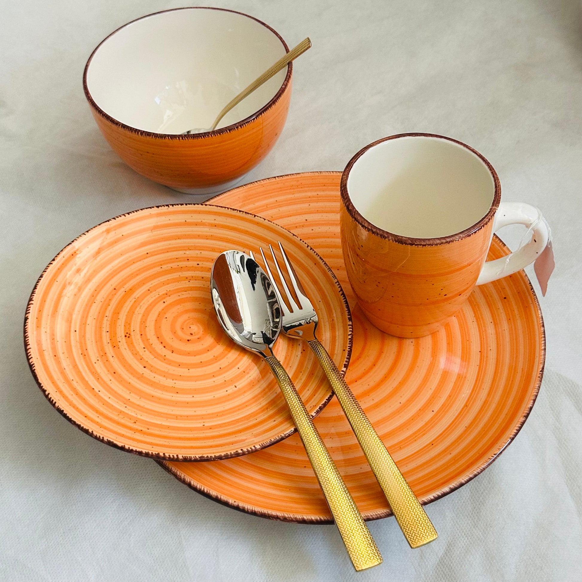 Say hello to sunshine on your table. The Tangerine Swirl Morning Set is a 16-piece breakfast set designed for four people, crafted to energize your mornings with its zesty charm and playful spiral design.