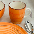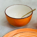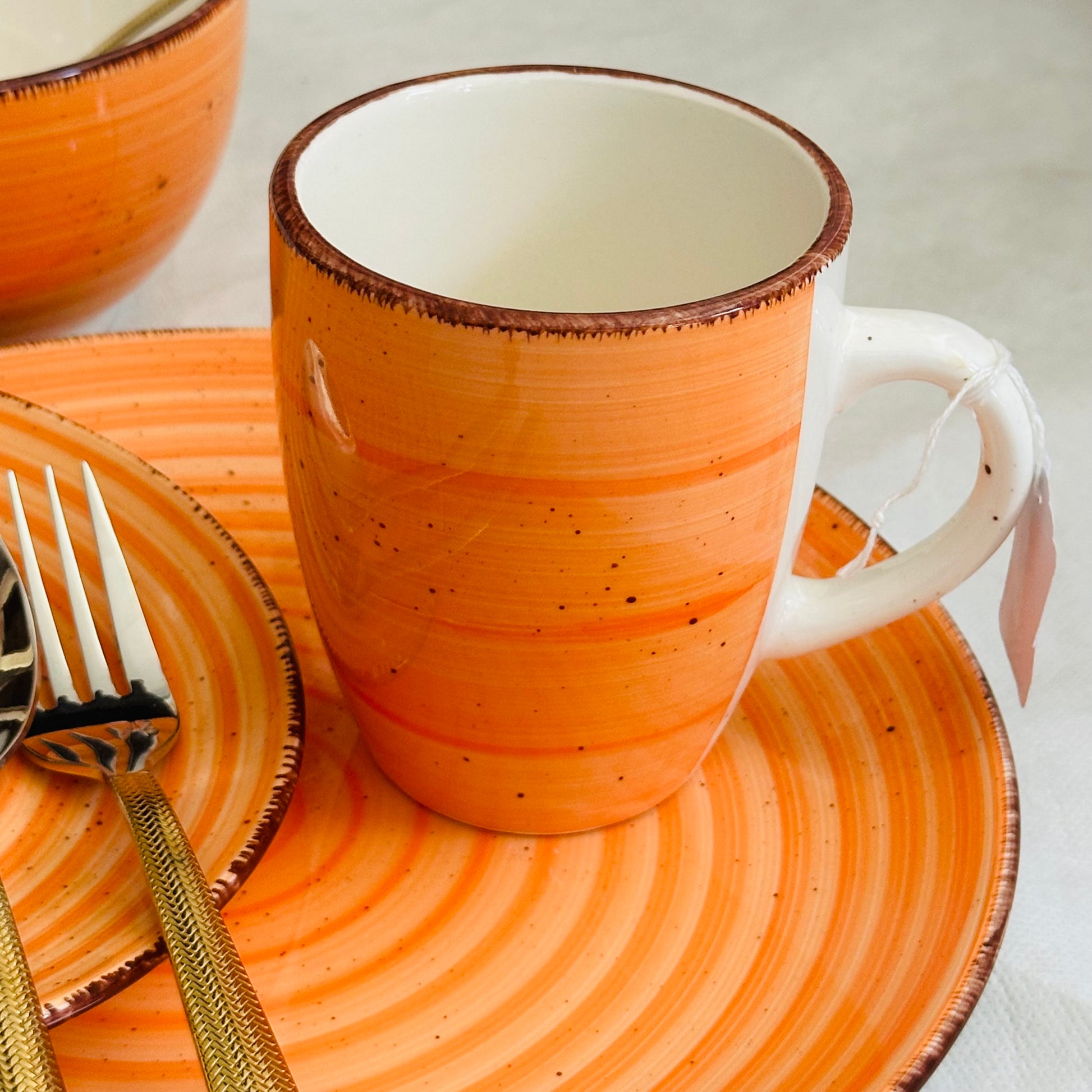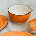 Vivid orange swirls dance across each piece, accented with rustic brown rims that add an artisanal touch. The mugs and bowls are glazed white on the inside for a clean, fresh finish, making every sip and bite feel warm and welcoming.
